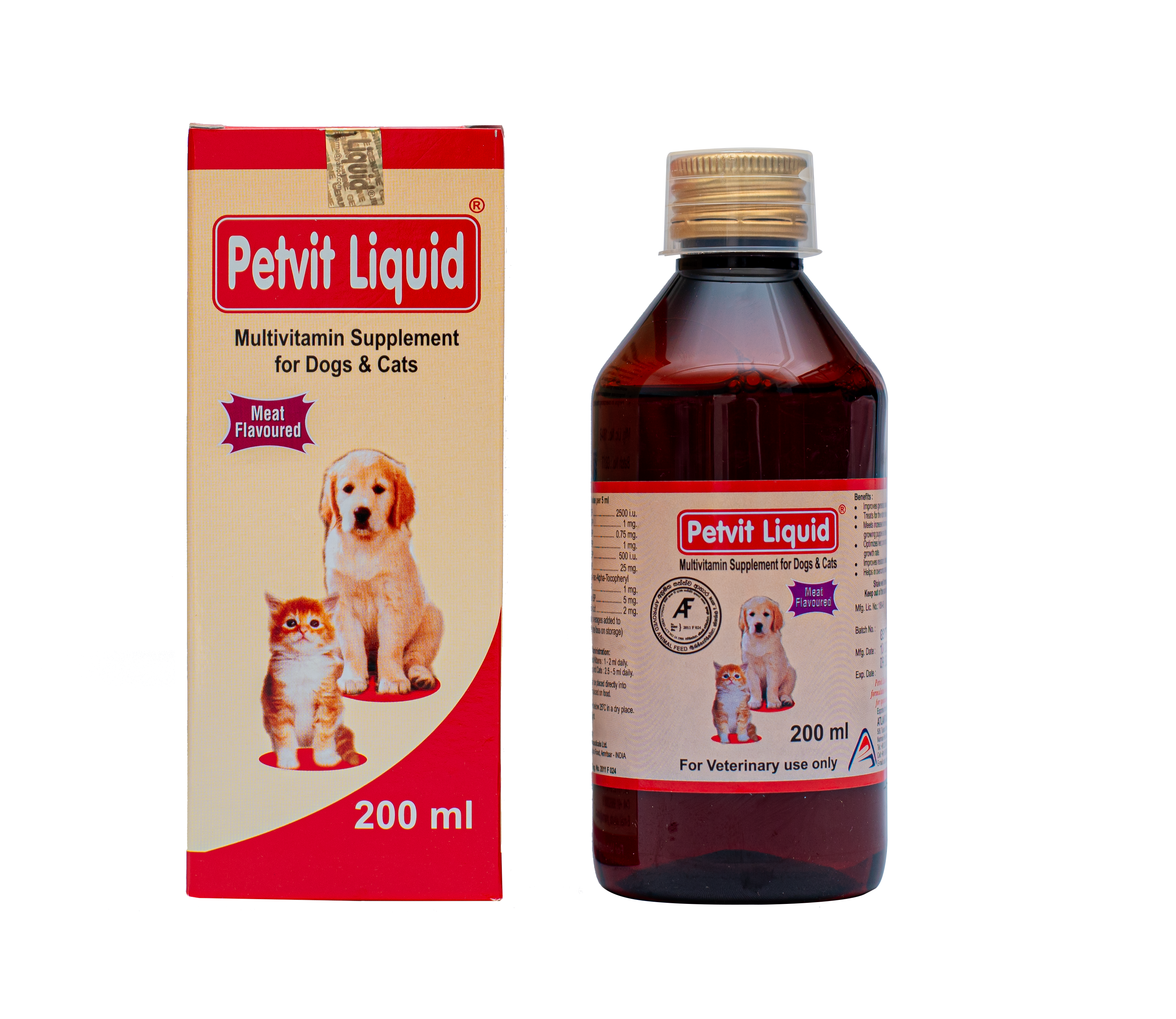 - Uses/ Indications – Petvit Liquid provides all 9 vitamins essential during growth of puppies and kittens, in pregnant or lactaing bitches/queens and also to keep dogs and cats in good condition. The daily administration of Petvit liquid ensures multiple vitamin supply to the growing organism to enchance metabolic activity. Petvit Liquid prevents disturbance in growing stage and development, promotes the formation of bones, increases the resistance to diseases, prevents inappetence and promotes the natural functions of the skin for a healthy coat. Vitamin A promotes the growth of puppies and kittens as well as the formation and the functioning of the skin.